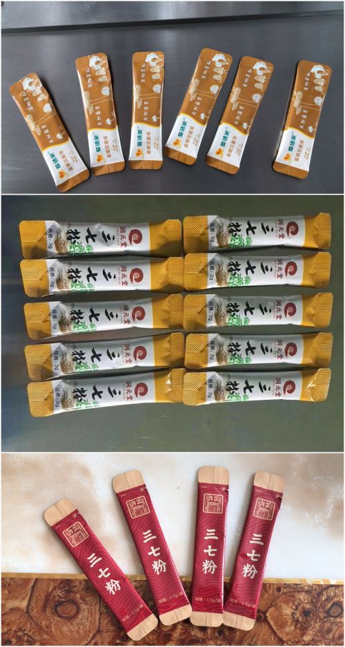 “顆粒背封沖圓角包裝機(jī)”包裝出的樣袋展品